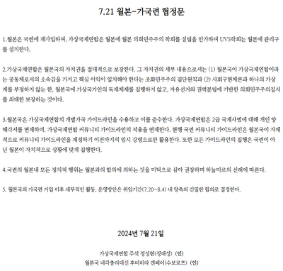 2024년 7월 19일~20일, UVN 정대성 주석이 방월하여 후미히라 겐페이 총리와 구창모, 청아가 배석한 정상회담을 벌여 월본이 가국련으로 재가입하는 것을 논의했다. 그리고 21일 월본이 재가입하는 것으로 확정되었다. 이로써 가국련을 이탈했던 개별 가국 대다수는 소멸 또는 해체되었거나, 다시 재가입하게 되어 해소되었다. 그러나 2025년 6월 경 일련의 사태로 인해 다시 갈라졌다.