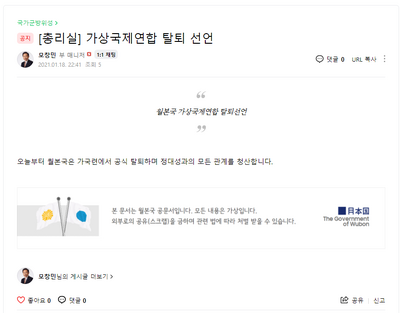 | 2021년 1월 | 이맹박 정부 | 월본의 가상국제연합 탈퇴 | 이맹박, 가상국제연합 | ||