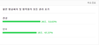 월본에서 활동하지 않는 사람인데 어떻게 월본 사람이라 할수있겠느냐라는 내용으로 흘러 어느새 교체 반대 측은 의장국 사임 안건을 발의하지만 민주우 총리는 국회 해산# 카드를 꺼내들어 무용지물로 만들었다. 당원이었던 맨체스터는 황실 폐지와 의장국 사임에 대한 국민 여론조사#를 실시하였고 실제로 찬성표가 2표차로 근소하게 더 많았다.[3]